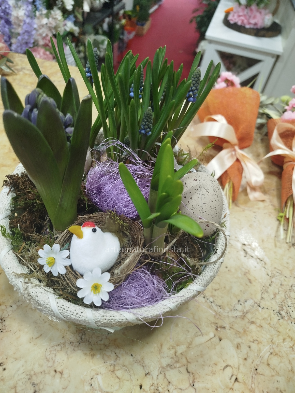 Scegli il nostro 'Cestino con bulbi' per aggiungere un tocco di bellezza e freschezza al tuo spazio, affidandoti a un fiorista di fiducia.