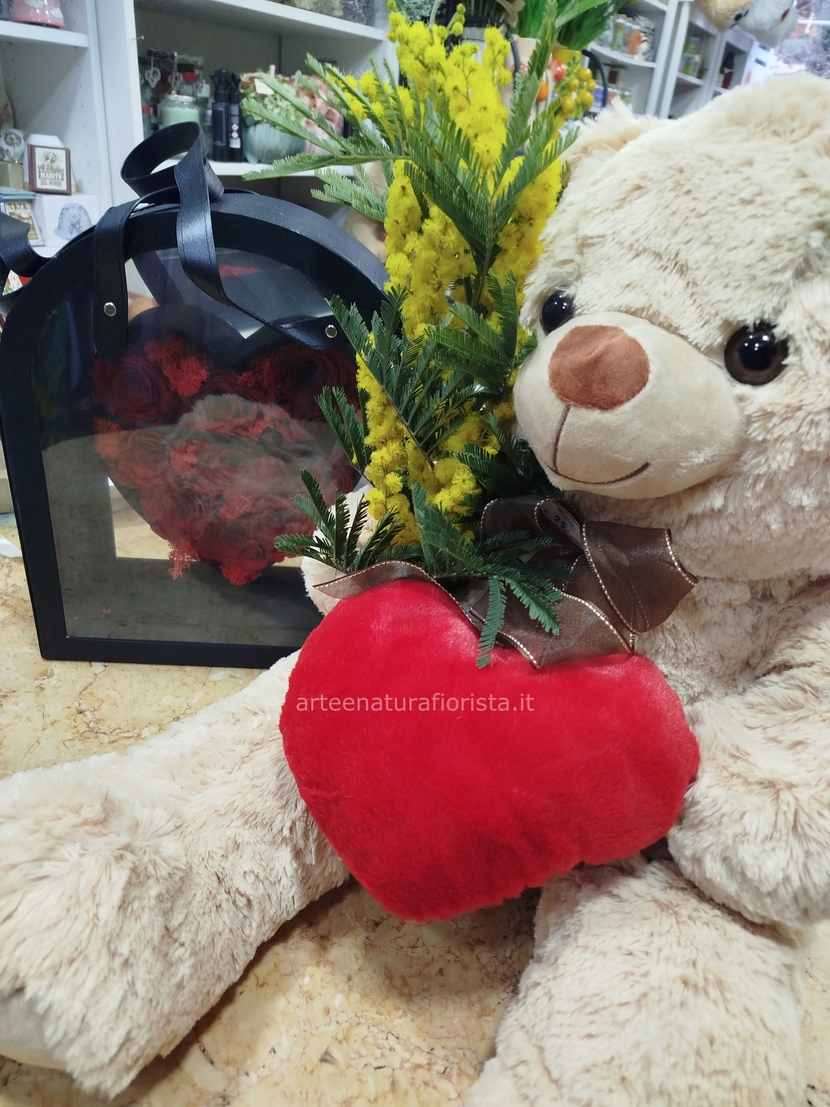 | Cuore di rose eterne con peluche e mimosa Cod. 125239 | € 120,00 | Quantità : | |