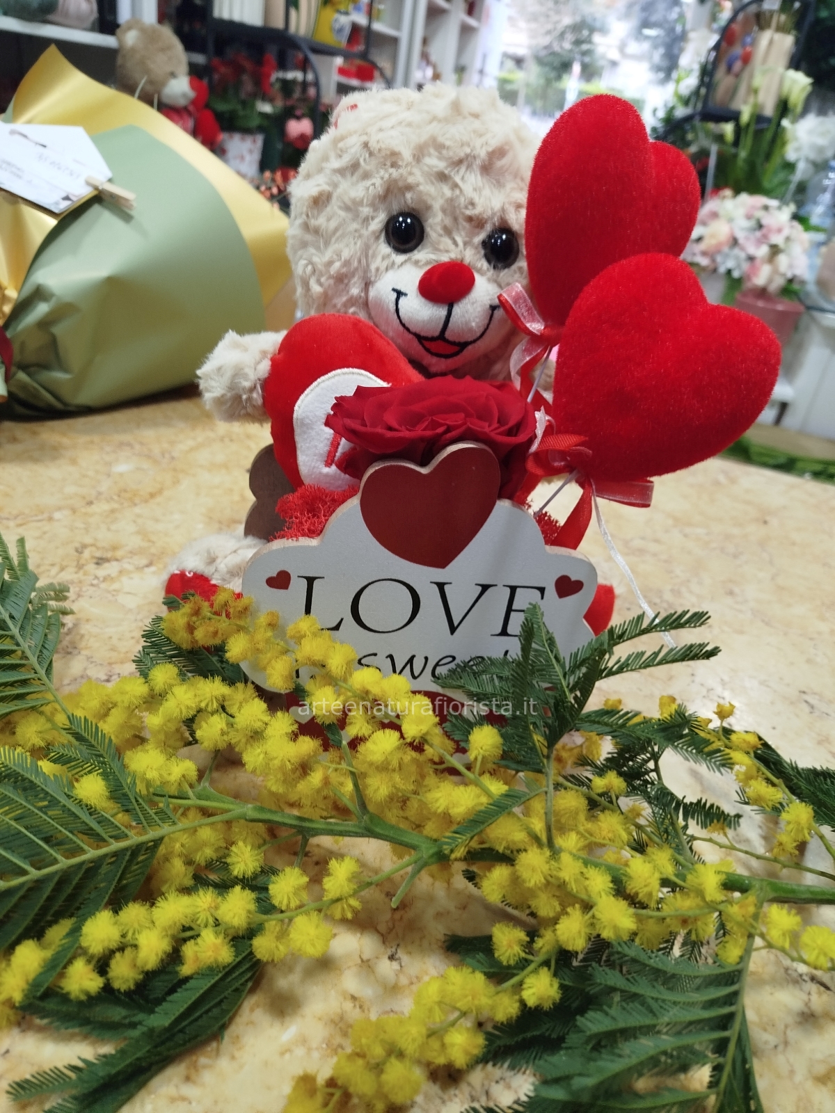 Peluche con rosa eterna e mimosa